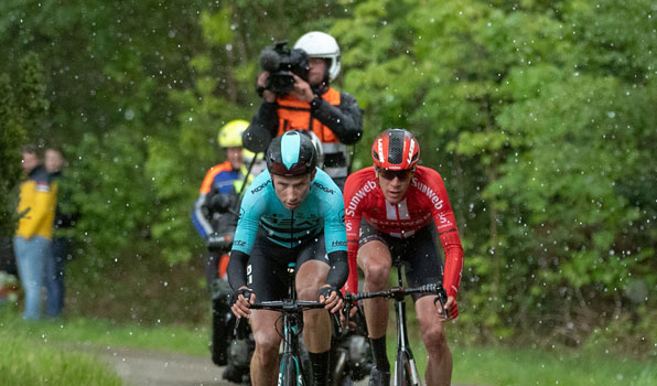 Bijschrift foto: Martijn Budding en Nils Eekhoff voor de cameramotor van Eurosport tijdens de Ronde van Overijssel in 2019. Eekhoff won de wedstrijd en kwam een paar maanden later als eerste over de streep tijdens het wereldkampioen wielrennen bij de beloften. Foto: Dick Soepenberg/Sportfoto.