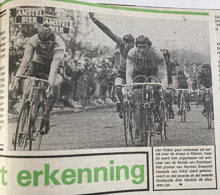 Ondanks een bijzondere sprint dacht Feiken in 1979 dat hij de winnaar was. “We reden met een kopgroep van negen man naar de finish in Rijssen,” blikt Feiken terug. “Op 250 meter voor de finish trok Frits Schür aan de rechterkant van de weg de sprint aan voor Herman Snoeijink. Ik reed op dat moment links van de weg in het wiel van Arie Versluis.