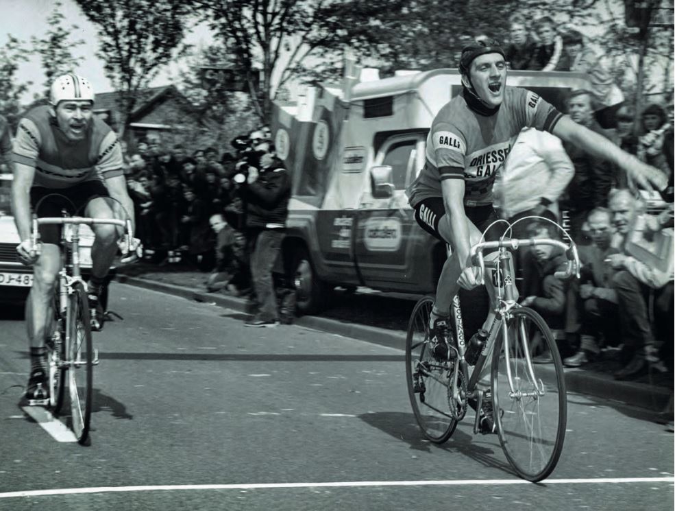 Jan Feiken (links) komt in 1979 als eerste over de streep in de Ronde van Overijssel. Op de achtergrond protesteert Herman Snoeijink.